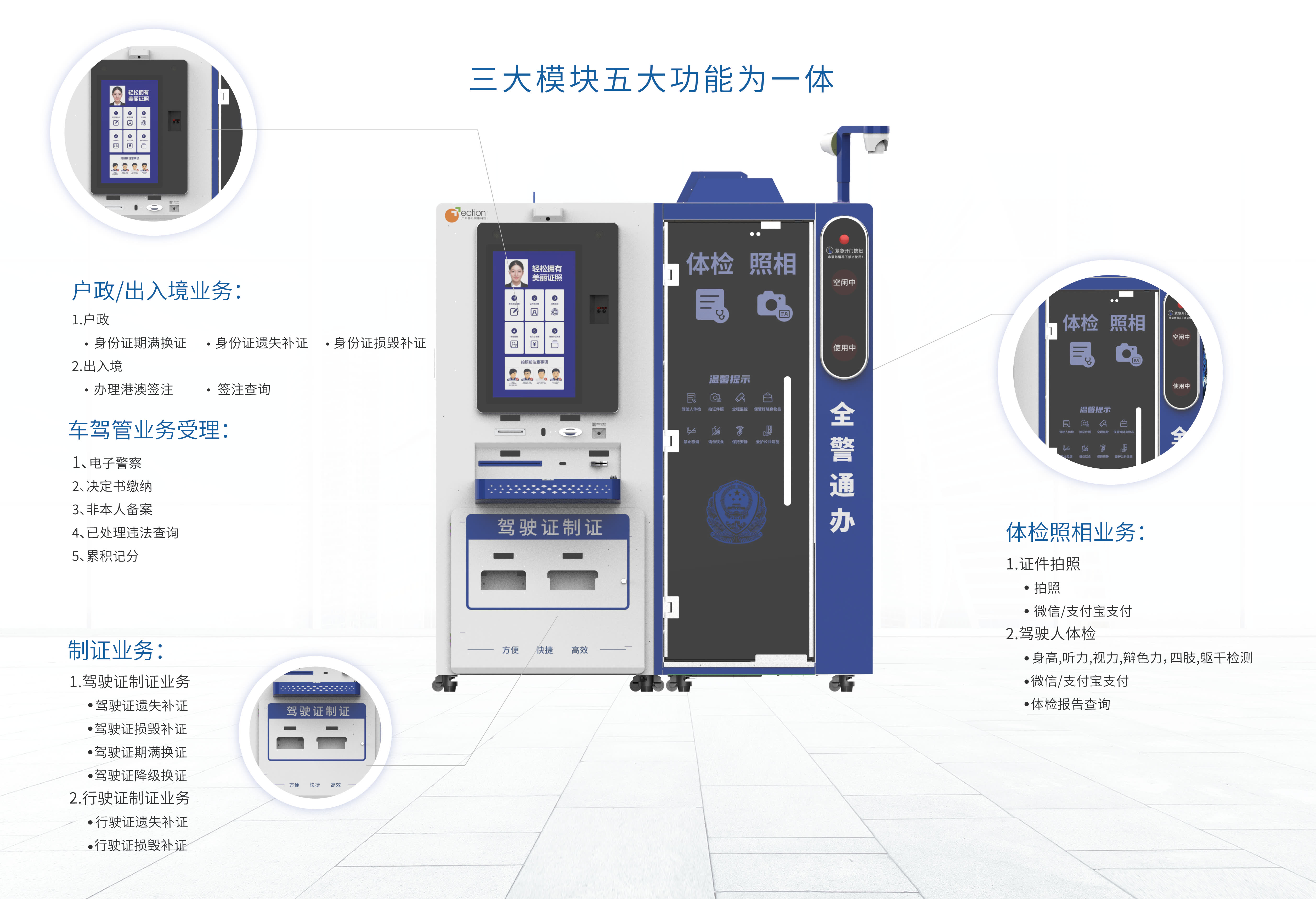全警通自助服务终端可以实现一站式办理户政、出入境、交管业务,更便捷专业,降本增效,可以放置在车管所、警务中心、派出所和政务中心等场所,依托信息化自主化手段,方便群众办理多样警务业务,落实“一窗通办”“马上办、就近办、一次办”等“放管服”改革项目落地。