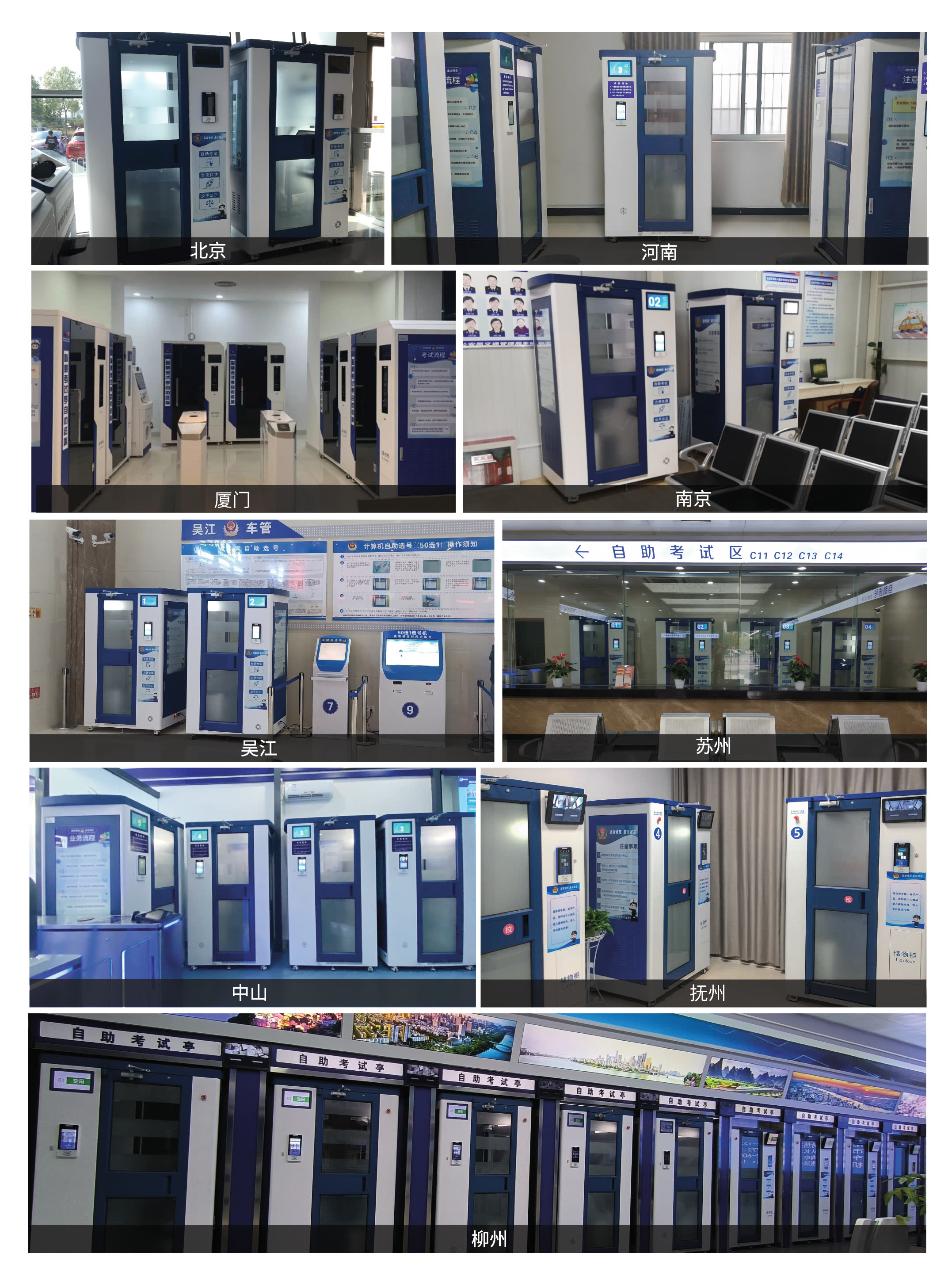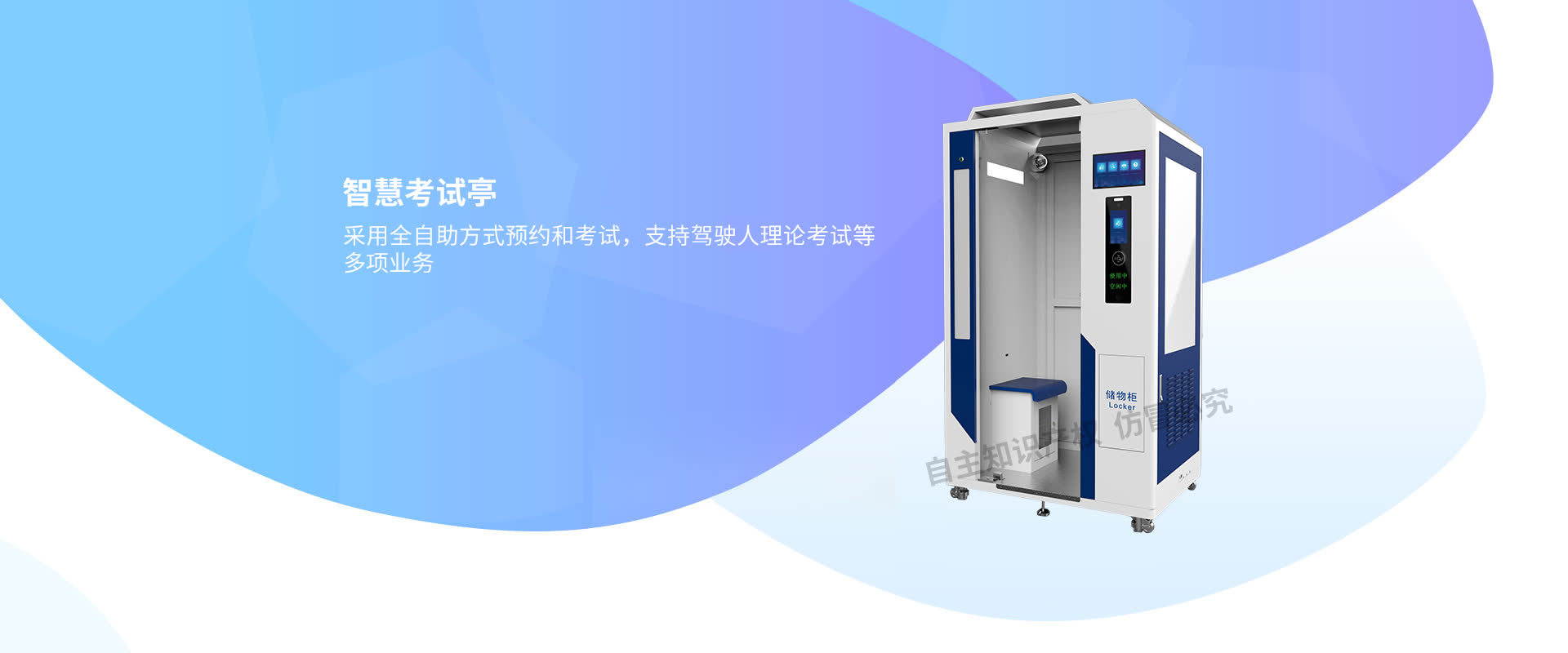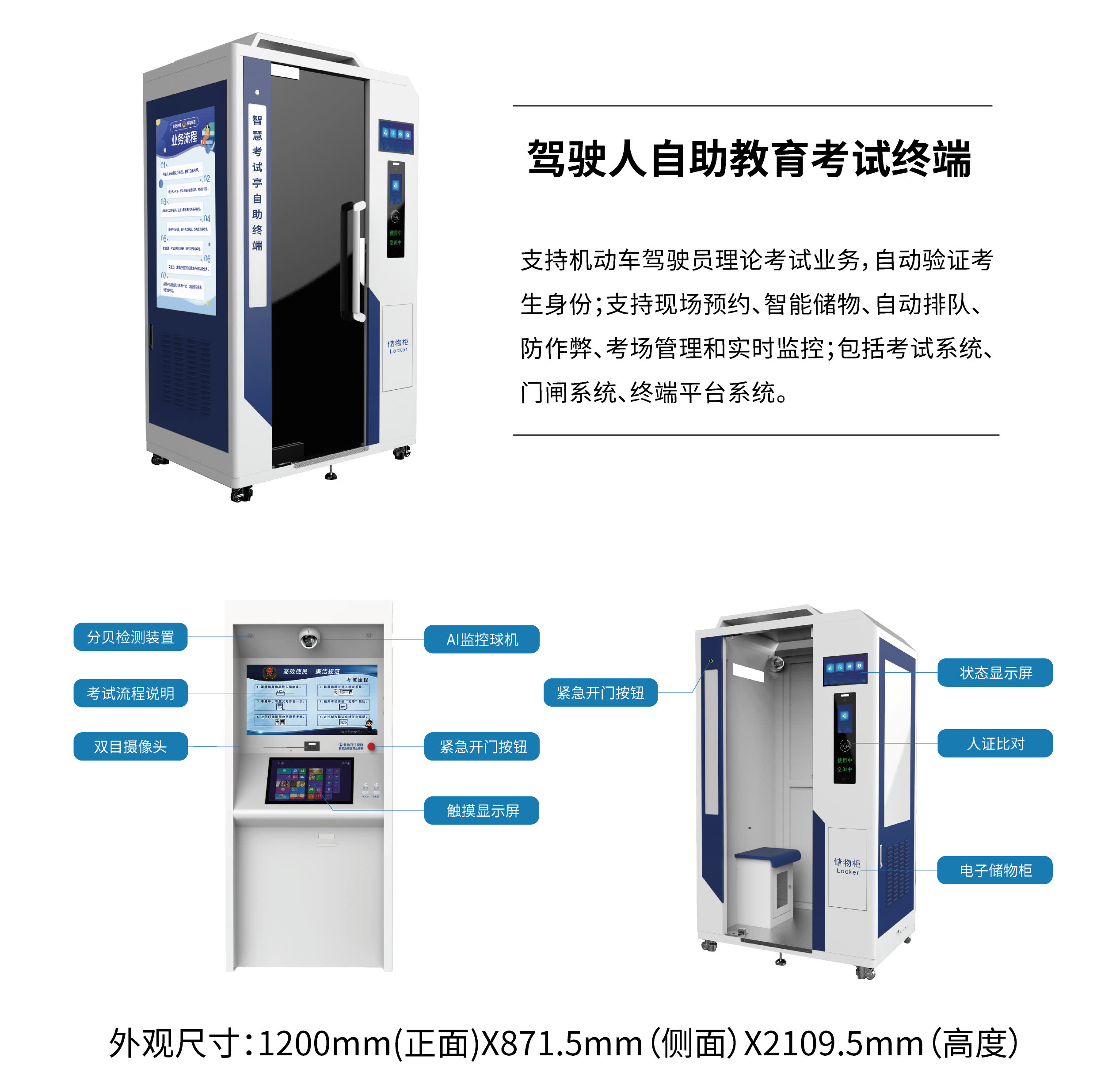 驾驶人自助教育考试亭支持驾驶人理论考试服务,支持现场预约、智能储物、自助分配考台、多样防作弊手段、考试管理和实时监控。整个系统包括考试系统、门闸系统和终端管理平台。