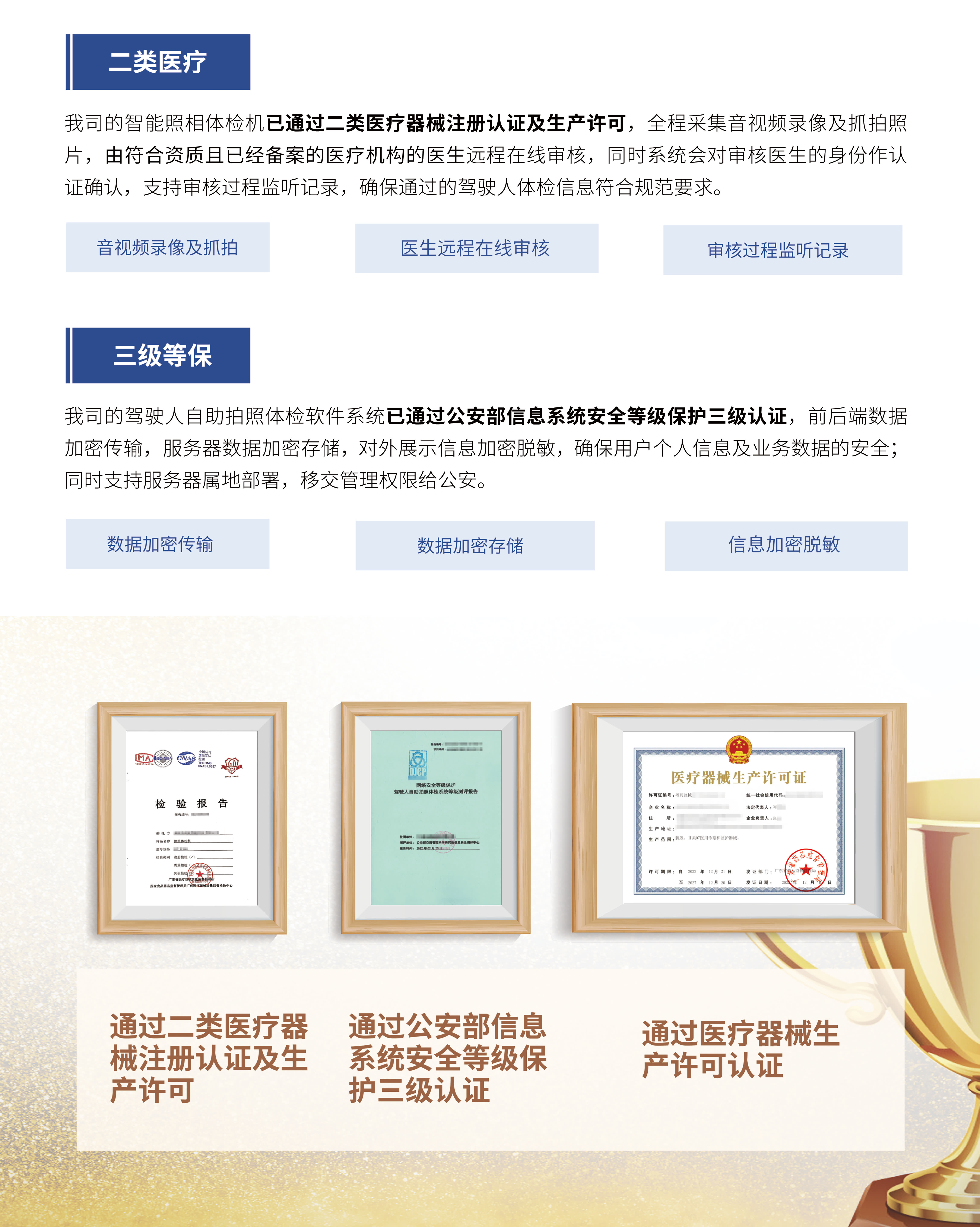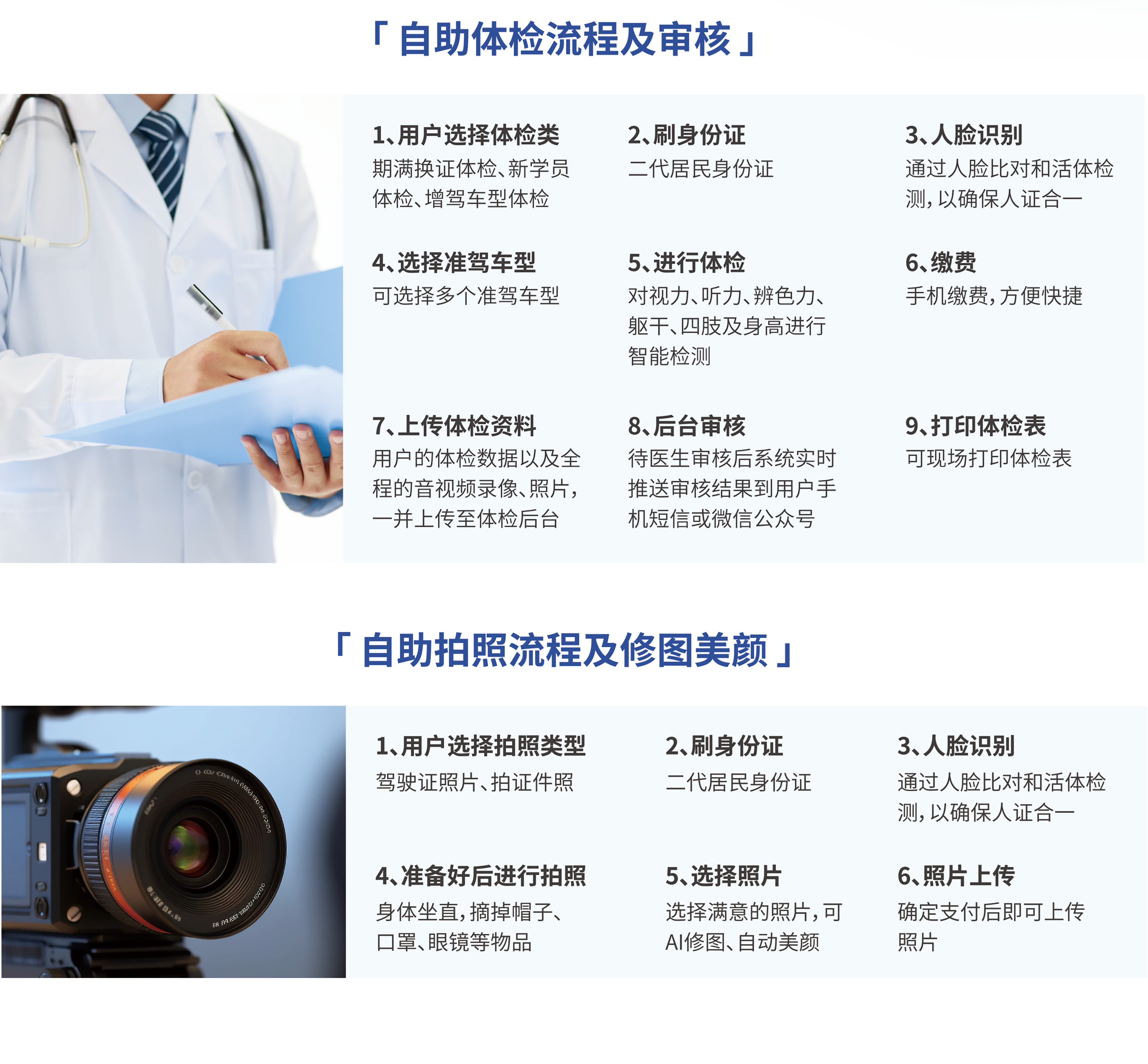 智能照相体检机集合驾驶人自助照相和体检功能,设备严格执行《中华人民共和国公安部第162号令》针对驾驶人身体条件的要求标准,准确采集视力、听力、辨色力、躯干、四肢及身高检测的数据,并且由符合资质且已经备案的医疗机构的医生远程在线审核并出具有效报告证明,所有审核通过的体检数据及拍摄照片加密上传至公安交通综合管理六合一系统,全程只需10分钟。